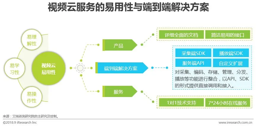 考虑到视频云服务中各个环节相对独立,它们通常被以模块化的方式提供给客户。端到端解决方案整合各环节需求,覆盖从移动端到Web端、从采集到播放的SDK和API,让客户快速实现强大而灵活的视频云功能,已经成为视频云厂商重要的竞争力来源。除产品打磨之外,视频云厂商还需要提供高质量和人性化的服务与支持,以帮助客户解决在视频云应用过程中遇到的各种问题。