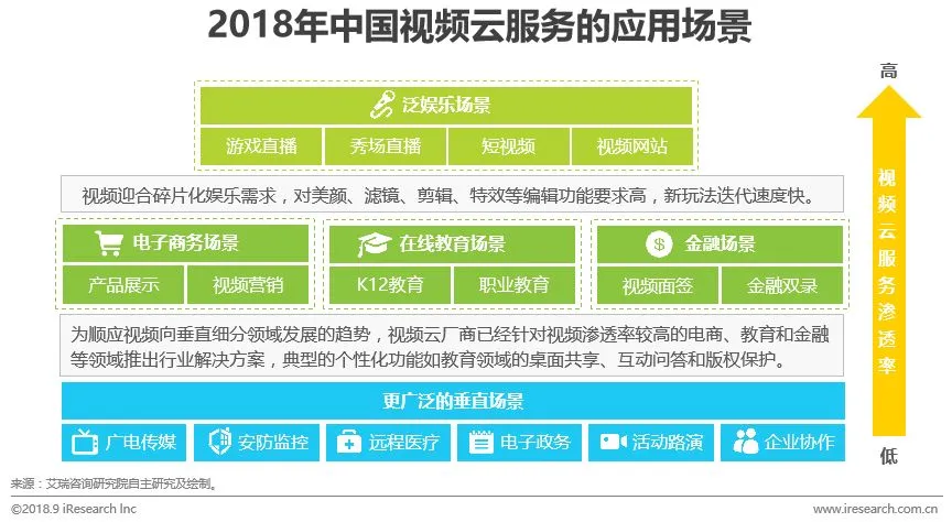 随着视频在信息传播中重要性显著提升,视频云与各行业的融合应用不断加深,开始在越来越多的场景中施展拳脚。现阶段,视频云在泛娱乐场景中的渗透率最高,教育、金融、电商次之,而在对视频需求强烈的广电、安防等传统行业则存在巨大的潜在机会。垂直场景的流量虽然不及泛娱乐场景,但是单路视频流的价值更高,有助于行业实现市场容量的扩张。在视频云功能趋同的环境中,深耕细分市场挖掘行业个性化需求,提供有针对性的增值服务,能够帮助视频云厂商树立起竞争壁垒,形成差异化的竞争优势。