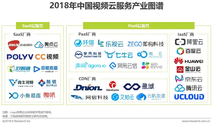 视频云服务的发展既受到在线视频行业的驱动,同时也反过来促进在线视频的繁荣。视频云领域最早出现的参与者是由互联网视频厂商发展而来的SaaS厂商,其产生背景是在线视频行业的专业分工以及云计算市场的起步。随着移动视频趋势的到来,在线视频的应用场景日益复杂多样,标准化的SaaS服务出现局限性。主流的公有云厂商和传统的CDN厂商相继进入市场,基于自身资源和技术优势对业务进行拓展和延伸,向客户提供PaaS层的视频云服务。与此同时,直播视频互动性的增强让视频云与通信领域的结合变得越来越紧密,不少专注提供实时通信的云厂商涉入视频云市场。