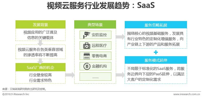 短视频的热度从2017年持续到2018年,视频应用在C端用户中的广泛普及已经毋庸置疑。随着人们越来越习惯将视频作为信息传递的关键载体,视频云服务在各类B端应用场景中的渗透率也将不断提高。SaaS服务侧重场景化应用,考虑到PaaS厂商通常不会将过多的精力集中在行业壁垒较高或行业需求特色的领域,广泛的垂直领域成为SaaS厂商的必争之地。围绕视频的核心辐射具有行业特色的增值服务,甚至向产业链上下游的产品和服务拓展,专注于特定垂直领域的视频云厂商将有望在竞争中取得先机。