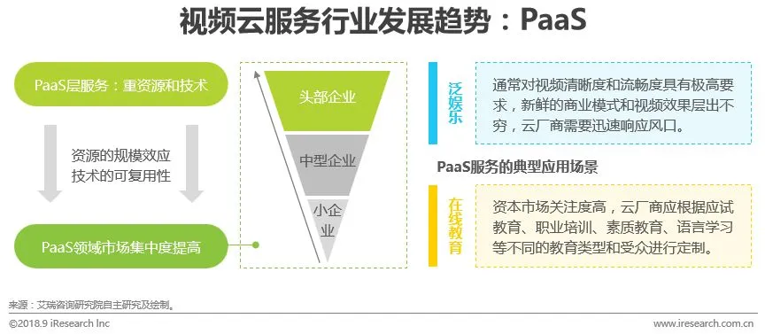 视频云服务中PaaS层服务多面向通用型需求,客户尤其看重厂商的资源与技术实力,资源的规模效应与技术的可复用性都将导致PaaS领域的市场集中度进一步提高。现阶段占据领先优势的云厂商会继续巩固优势地位,留给新进入者的机会将比较有限,许多中小型的PaaS厂商也面临着被市场淘汰的风险。