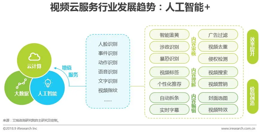 在云计算、大数据与人工智能趋向三位一体的背景下,视频云厂商在上传、转码、分发、播放的基础服务上,不断探索新的增值服务,从视频内容审核到可以直接驱动流量变现和内容生产的视频内容理解和视频内容编辑。尽管目前“AI+”在客户群体中的渗透程度相对有限,但考虑到人工智能技术的应用将能够带来效率提升、价值创造的显著作用,从而提升视频云服务对客户的价值,势必会成为下一阶段行业发展的重要方向。