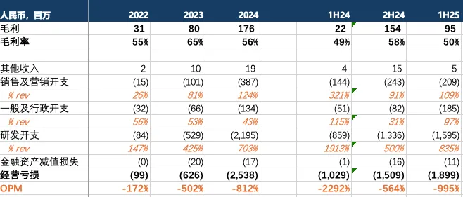 2024 年的收入3.1亿人民币(其中 86% 都集中在 2H24),1H25 的收入1.9亿人民币。增速都是三位数,但是收入规模非常小。