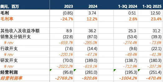 毛利率在 23 年是负24.7%,24 年转正到 12%,25 年前三季度维持在二十多的毛利率。