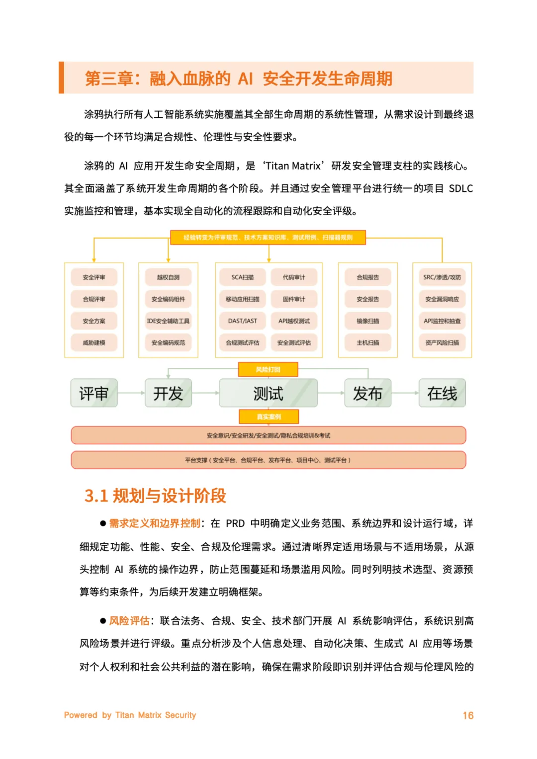 在实践层面,白皮书详细说明 AI安全开发生命周期(SDLC) 的五大阶段管控:规划与设计阶段强制执行AI影响评估与风险分级;数据与模型开发阶段遵循数据最小化原则,实施对抗攻击防护;部署与上线阶段通过安全网关与人类监督机制双重校验;运营监控阶段利用AI驱动的威胁检测与自动化响应(SOAR);退役归档阶段确保数据安全处置。