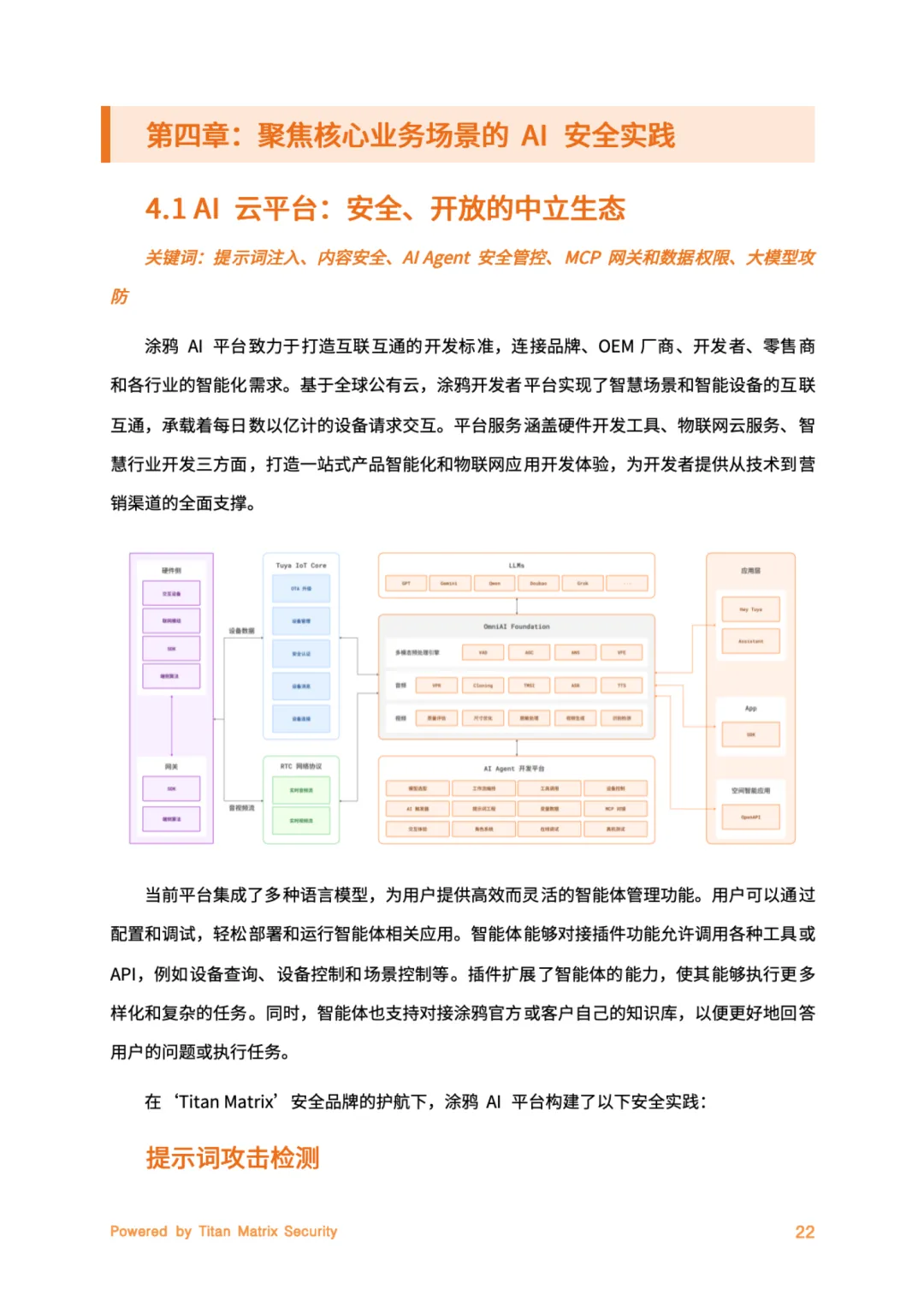 针对核心业务场景,涂鸦提出差异化防护方案:在 AI云平台 部署大模型防火墙防御提示词注入攻击,实施MCP服务权限隔离;为家庭场景的 Hey Tuya助手 配备端到端加密与内容安全过滤;面向儿童的 AI玩具 满足COPPA等法规要求,采用“一机一密”通讯加密。此外,涂鸦建立覆盖 欧盟《AI法案》、中国《生成式AI办法》、美国CCPA等46项法规 的映射矩阵,推行“合规-by-Design”技术架构(如数据匿名化、动态权限控制),并通过透明度报告机制践行公开承诺。未来,涂鸦将持续深化边缘智能安全、深度伪造防御等前沿领域,赋能开发者构建原生安全的AI应用。