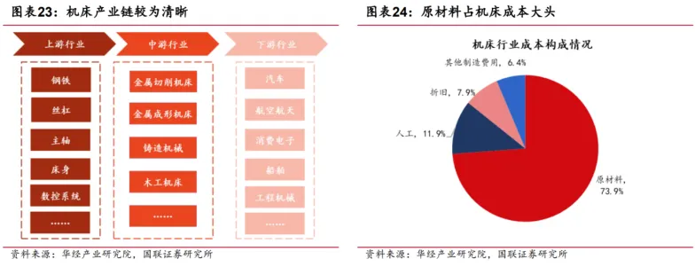 原材料占机床成本大头。在机床生产过程中,原材料成本占比最高,为 73.9%, 其次是人工、折旧与其他制造费用,占比分别为 11.9%、7.9% 和 6.4%。