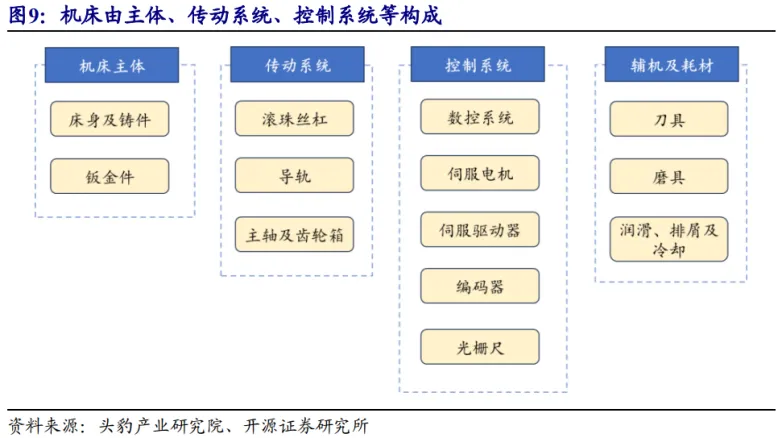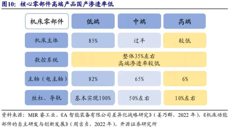 机床核心零部件包括数控系统,编码器、光栅尺,滚珠丝杠,主轴,导轨,转台等。其精度及可靠性对机床性能影响较大。我国核心零部件依赖海外进口,高端领域国产渗透率低,技术水平较海外厂商有一定差距。