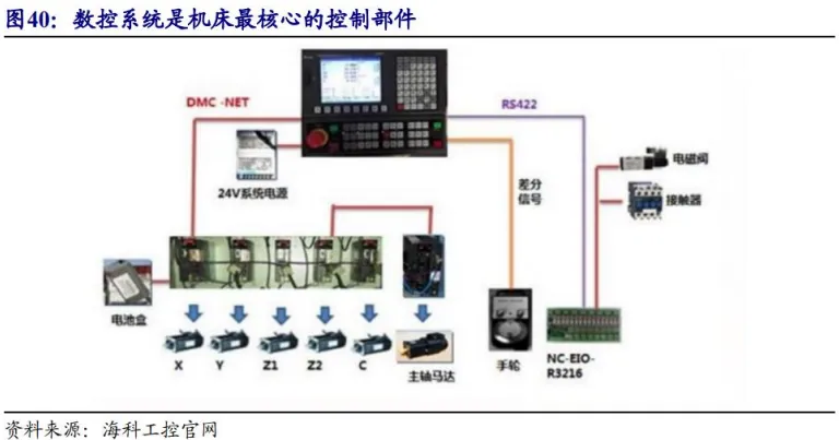 数控系统是数控机床的控制系统,由驱动器、控制器、电机构成,是机床最核心的控制部件。高档数控系统价值约占机床成本的20%-40%。
