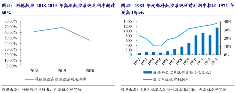 数控系统具有利润高、粘性强的特点。作为数控机床最核心的部件,数控系统掌控着工业母机运作过程中的稳定与作业安全,因此客户粘性强、毛利率高。利润率方面,以日本发那科为例,1972 年发那科从富士通集团独立后,当年数控系统的税前利润率为 23.2%, 随着产品迭代性能增强、客户认可度提升及粘性加大,到 1983 年,发那科数控系统的税前利润率提升至 38%。而国内厂商科德数控在 2018-2019 年以销售航空航天用高端数控系统为主的时期,毛利率一度高于 60%。