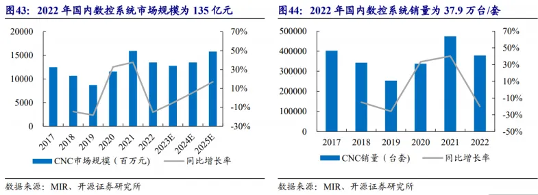2022年,我国数控系统市场规模约为135亿元。根据MIR数据,2022年,我国数控系统市场规模约为135亿元,数控系统销量达37.9万台 / 套。