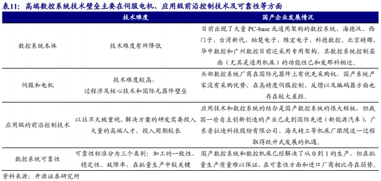 我国高端数控系统的技术壁垒,主要在伺服电机、应用级前沿控制技术及可靠性等方面。从中高档数控机床技术上看,国内企业在工艺技术和关键共性技术投入上布局广泛,但在前沿技术上较国外有较大差距,且在可靠性、数字化设计及动态误差补偿等技术上还存在一定缺口。高性能伺服和驱动技术是国内与海外差距最大的技术之一。
