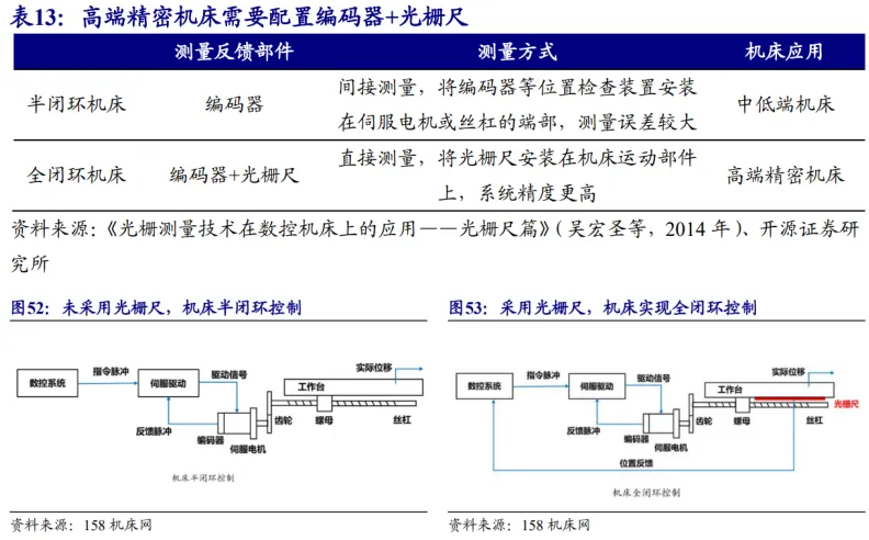 中低端机床一般只使用编码器,高端精密机床需要同时配置编码器+光栅尺。数控机床伺服控制系统分为半闭环与全闭环控制系统两种。其中,半闭环控制使用间接测量,将编码器等位置检查装置安装在伺服电机或丝杠的端部,测量误差较大;全闭环控制能够实现终端位移的直接测量,将光栅尺安装在机床运动部件上,系统精度更高,多见于高端精密机床;且机床精度几乎只取决于光栅尺精度和安装位置。