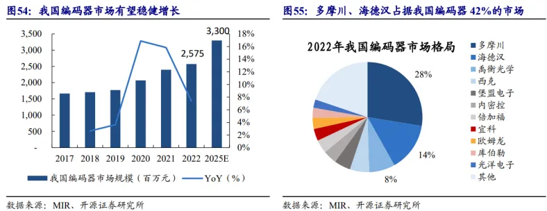 我国编码器市场稳健增长,40% 以上的市场被多摩川、海德汉占据。根据 MIR 数据,2022 年我国编码器市场规模约为 25.75 亿元,同比增长 7.4%; 预计到 2025 年将增长到 33 亿元,2022-2025 年 CAGR 达 8.6%。根据 MIR 统计,按销售额计算,我国编码器 42% 的市场被多摩川、海德汉两家外资厂商占据,国内厂商禹衡光学市场占比 8%, 位列第三。