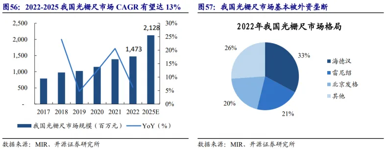 相比编码器,我国光栅尺市场增长较快,市场基本被外资垄断。根据 MIR 数据,2022 年我国光栅尺市场规模约为 14.73 亿元,同比增长 6.2%; 预计到 2025 年将增长到 21.3 亿元,2022-2025 年 CAGR 达 13%。光栅尺市场基本被多摩川、雷尼绍、北京发格 (母公司西班牙发格) 等外资厂商占据。