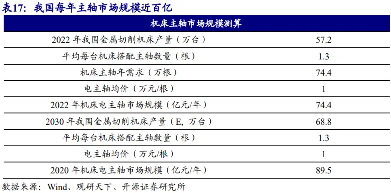 我国每年主轴市场规模近百亿。按每台机床平均搭配 1.3 根主轴 (部分机床搭载 2 根主轴), 主轴均价 1 万元计算,机床加工环节和加工时长都会影响其寿命。以无心磨床为例,机床每使用 2000 小时就需要更换一次主轴,每年约更换 4 次,存量替换空间可观。