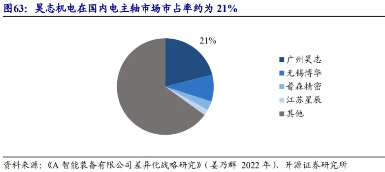 我国电主轴竞争格局分散,量产厂商较少。根据《A 智能装备有限公司差异化战略研究》数据统计,我国电主轴主要厂商包括昊志机电、无锡博华等。龙头企业昊志机电市占率约为 21%。大部分市场被企业自制或中小厂商占据。