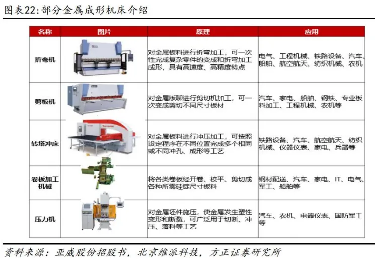 金属成形机床是通过对金属施加强大作用力使其发生物理变形从而得到想要的几何形状。压力成形技术,利用压力实现金属板或金属体成形,或进行分割剪切、折弯及其他冲压。金属成形机床又可以分为压力机、冲压机、剪板机、冲床、折弯机等。金属成形机床领域上市公司主要有亚威股份、思进智能。