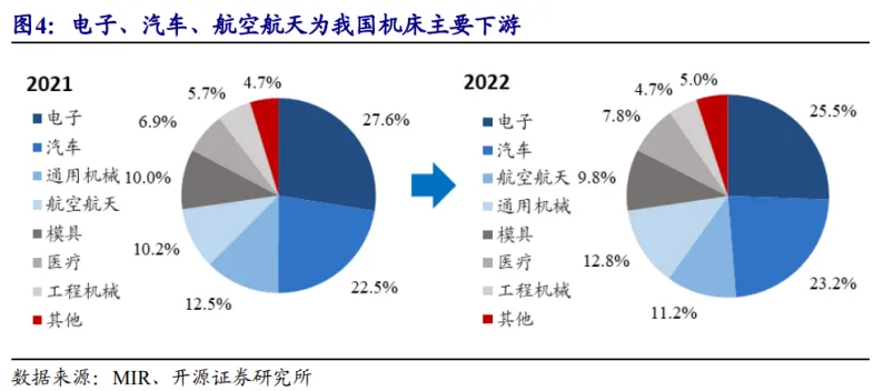 电子、汽车、航空航天为机床主要下游。2022 年,我国电子、汽车、航空航天、模具在工业母机下游中占比分别达 25.5%/23.2%/11.2% 和 9.8%。其中,电子行业设备更新周期快,需求分散,2022 年依赖逐渐疲软,但有望随新一轮苹果周期复苏;新能源板块的风电、光伏以及航空航天、军工等战略性产业发展态势较好;医疗等平行产业处在大的产品形态和加工装备升级周期中,模具等中间产业受下游需求带动 (如新能源车等), 总体占比稳定。