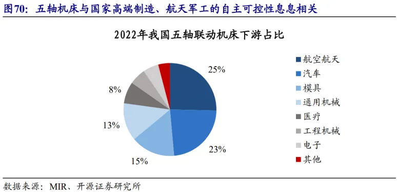 五轴联动机床是我国把握航空航天核心领域自主可控、提升民用高端制造水平的关键环节。五轴联动机床广泛应用于航空航天、精密设备、城市轨道交通、新能源汽车等领域。2022 年,我国五轴联动机床前两大下游分别为航空航天 (25%) 和汽车 (23%)。