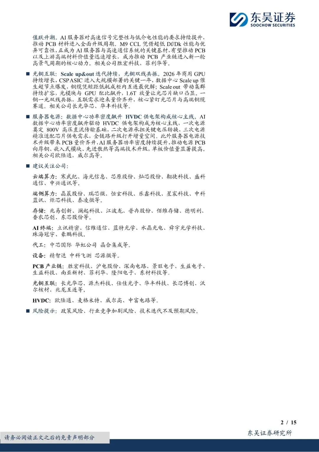 端侧算力:端云混合为 AI 场景赋能,端侧 SoC 持续受益于 AI 创新浪潮。端侧 AI 接力云 AI,端云混合架构夯实场景基础,海外大模型有望率先驱动 AIoT 落地并利好眼镜、汽车、机器人三大先导场景。投资维度看,26H1 消费类上游公司或普遍受到存储涨价压制,但展望 26H2,结合消费周期以及 AI 创新等多重因素看好可穿戴 AIoT 等新品发布带来的产业链机遇。同时,考虑到 26 年有望成为 NPU 落地元年,相关公司瑞芯微、晶晨股份等。