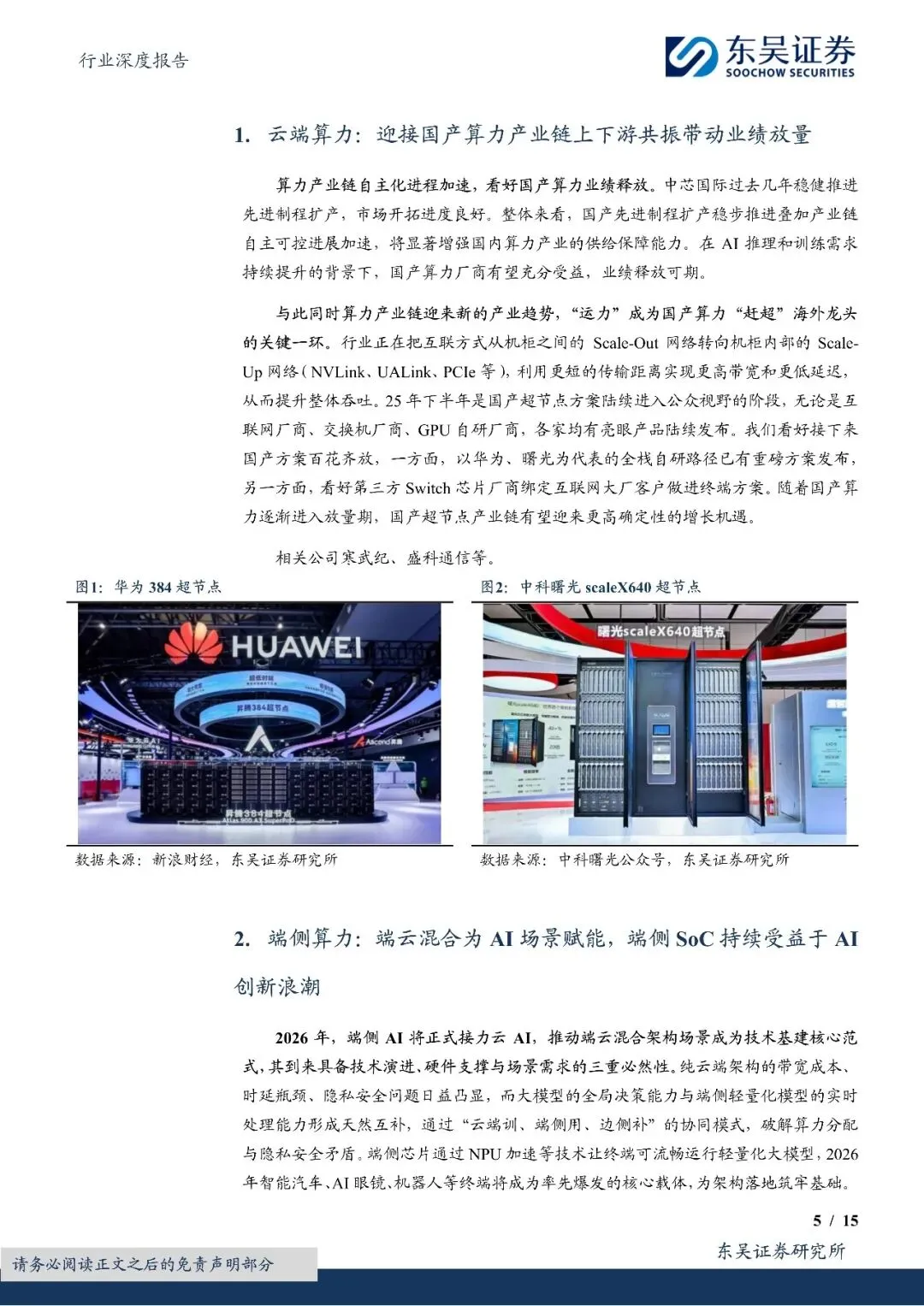 云端算力:迎接国产算力产业链上下游共振带动业绩放量。2026 年国产算力芯片龙头有望进入业绩兑现期,看好国产 GPU 受益于先进制程扩产带来的产能释放。考虑到国产算力芯片各家参与者为争夺市场份额而抢夺产能资源,看好 AI ASIC 服务商在供应链中的关键角色。同时,国产算力进入超节点时代后,既考验 GPU 厂商的单卡实力,同样考验Switch 芯片的国产化水平,国内外政府或将对此环节有所管控。相关公司寒武纪、盛科通信等。