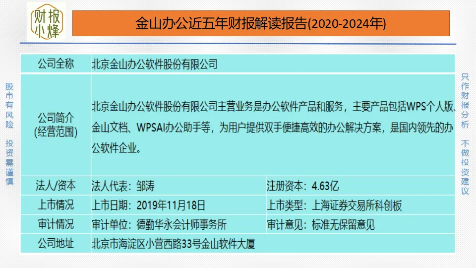 通过上图,我们对金山办公是做什么的、从事什么行业以及做得怎么样有了大概了解。但这些还不够,想要进一步了解该公司,还需要对其财报进行深入分析。财报小烽只分析审计意见为“标准无保留意见”的上市公司,因为该公司的财报真实性和准确性都比较高,朋友们应该远离不是此意见报告的公司。
