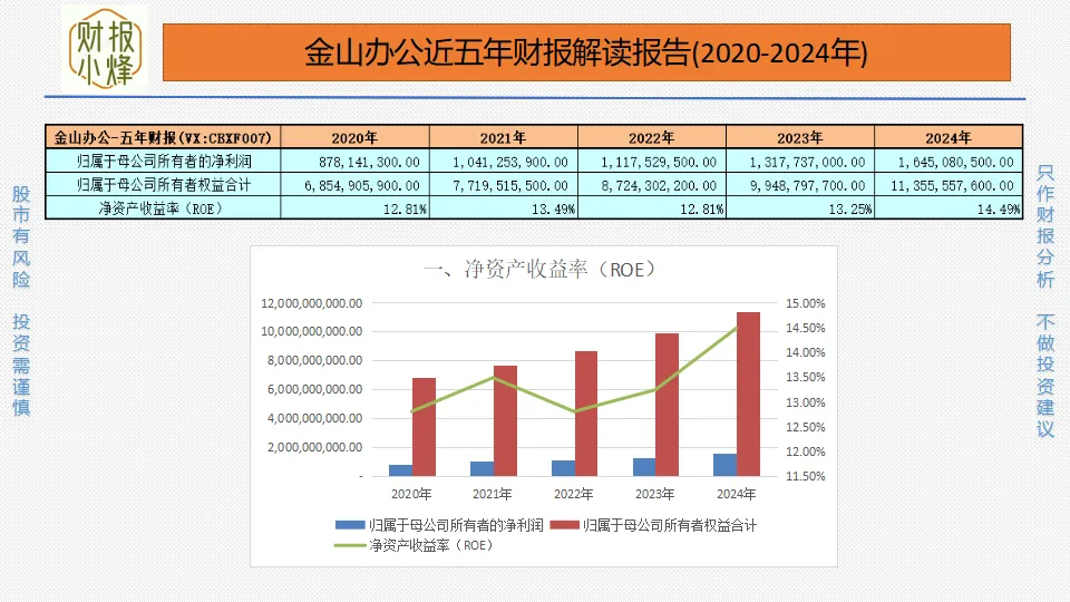 2020年至2024年,金山办公的归母净利润分别为8.78亿元、10.41亿元、11.18亿元、13.18亿元、16.45亿元,净资产分别为68.55亿元、77.20亿元、87.24亿元、99.49亿元、113.56亿元,净资产收益率分别为12.81%、13.49%、12.81%、13.25%、14.49%,一直低于15%,股东回报适中,资产盈利稳健。