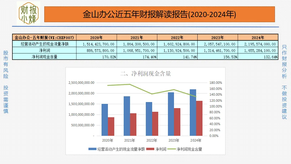 2020年至2024年,金山办公的净利润分别为8.87亿元、10.69亿元、11.31亿元、13.14亿元、16.55亿元,净利润现金含量分别为170.82%、174.40%、141.74%、156.53%、132.64%,一直大于100%,净利润含金量高,现金创造能力强,似真金白银,实实在在。
