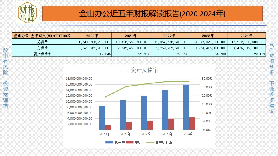 2020年至2024年,金山办公的总资产分别为85.12亿元、104.26亿元、120.58亿元、139.74亿元、159.13亿元,总负债分别为16.21亿元、26.45亿元、32.59亿元、39.54亿元、44.76亿元,资产负债率分别为19.04%、25.37%、27.03%、28.30%、28.13%,一直低于30%,且呈温和上升态势,偿债风险低,财务结构安稳。