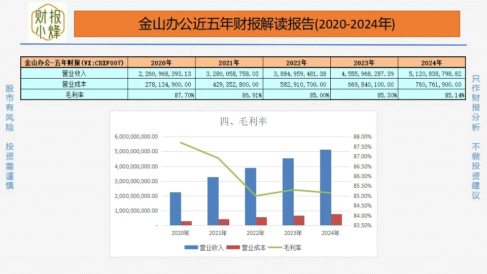 2020年至2024年,金山办公的营业收入分别为22.61亿元、32.80亿元、38.85亿元、45.56亿元、51.21亿元,营业成本分别为2.78亿元、4.29亿元、5.83亿元、6.70亿元、7.61亿元,毛利率分别为87.70%、86.91%、85.00%、85.30%、85.14%,一直远大于40%,产品竞争力强,盈利水平高。