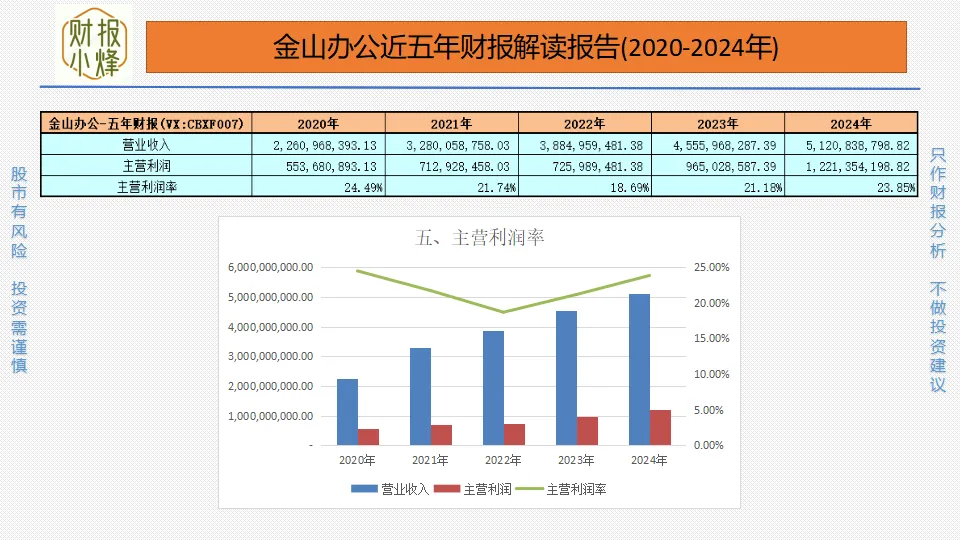 2020年至2024年,金山办公的主营利润分别为5.54亿元、7.13亿元、7.26亿元、9.65亿元、12.21亿元,主营利润率分别为24.49%、21.74%、18.69%、21.18%、23.85%,一直大于15%,核心业务盈利稳健,利润质量良好,似源泉活水,源源不绝。