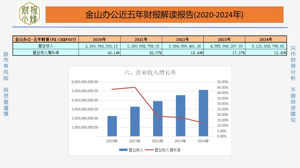 2020年至2024年,金山办公的营业收入分别为22.61亿元、32.80亿元、38.85亿元、45.56亿元、51.21亿元,营业收入增长率分别为43.14%、45.07%、18.44%、17.27%、12.40%,一直大于10%,虽增速放缓,但成长性稳健,如同长跑健将,耐力持久。