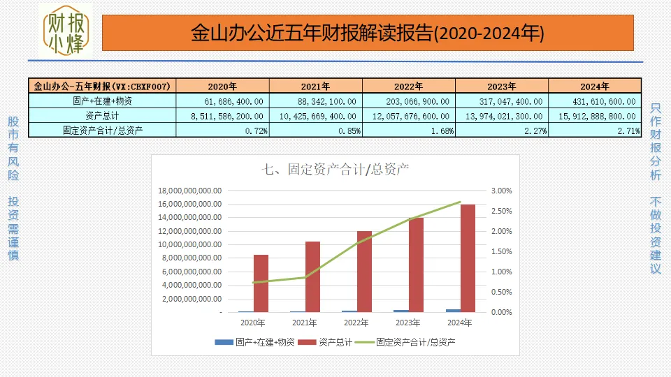 2020年至2024年,金山办公的固定资产与在建工程、工程物资合计分别为0.62亿元、0.88亿元、2.03亿元、3.17亿元、4.32亿元,其合计占总资产比值分别为0.72%、0.85%、1.68%、2.27%、2.71%,一直远低于40%,属于轻资产运营,成本控制佳,资产结构灵活。
