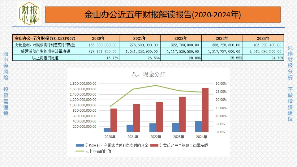 2020年至2024年,金山办公的现金分红金额分别为1.38亿元、2.77亿元、3.23亿元、3.37亿元、4.06亿元,现金分红率分别为15.75%、26.56%、28.88%、25.55%、24.70%,平均值高于20%,分红慷慨,股东回报可观。