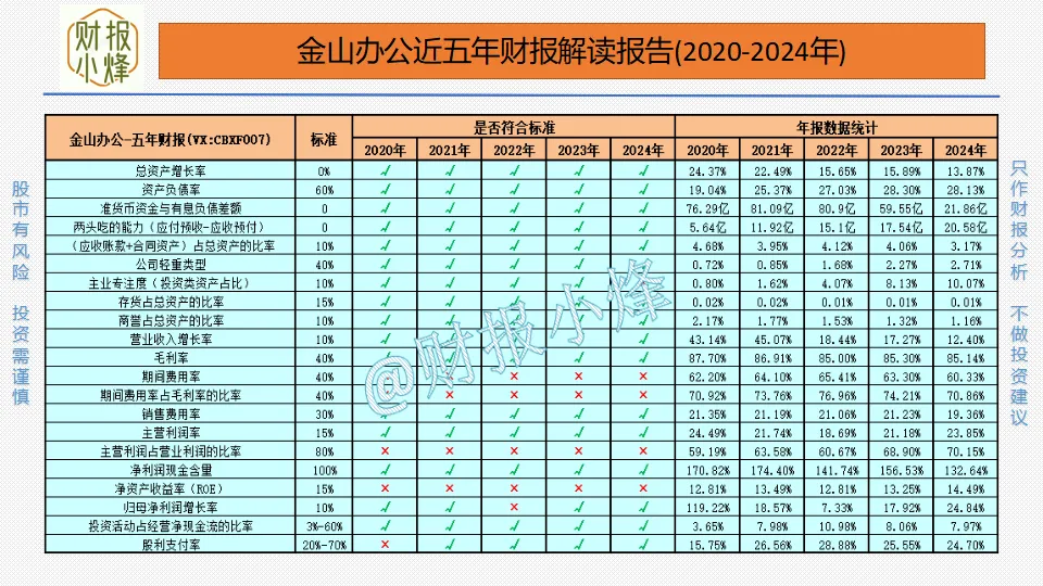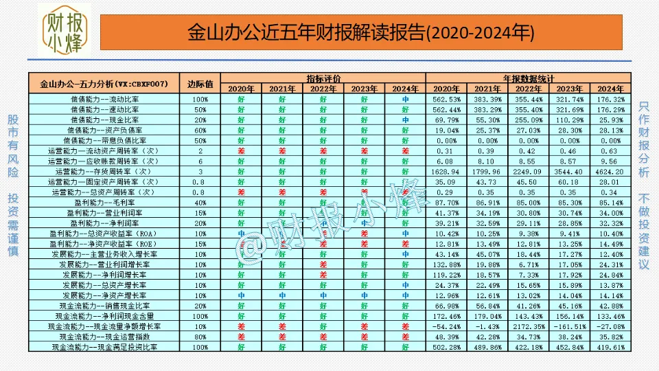 以上是八个关键财务指标的分析,只能判断大概方向,想要对金山办公进行深层次的了解,我们还应该整体分析21个财务指标,这里为了给大家节约时间,小烽特将金山办公的21个财务指标整体情况做了两张图表提供给大家。