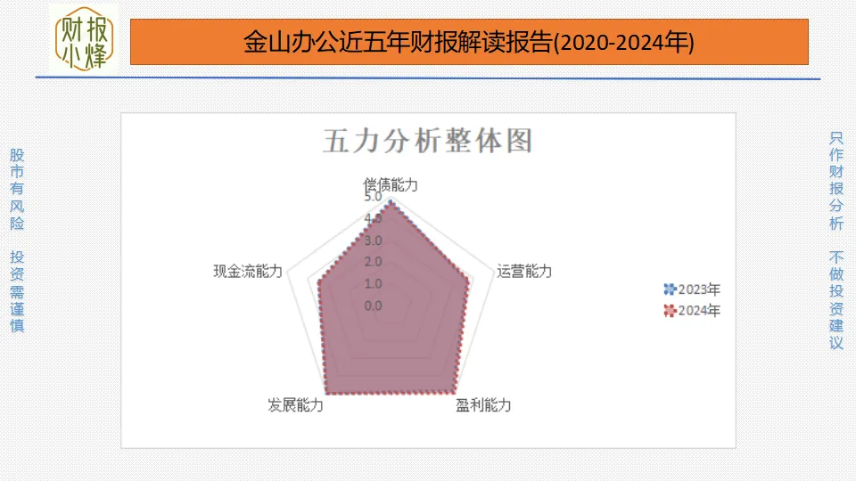 金山办公的偿债能力与去年同期相比持平,保持在高水平;运营能力与去年同期相比持平,保持在中等水平;盈利能力与去年同期相比持平,保持在高水平;发展能力与去年同期相比持平,保持在高水平;现金流能力与去年同期相比持平,保持在中等水平;整体来看“五力”基本稳定。