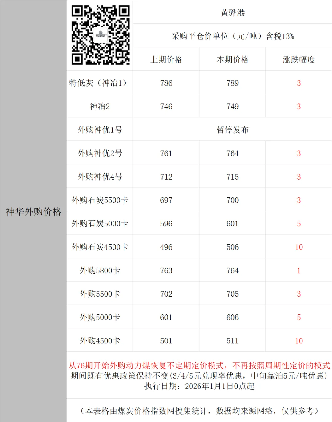 从76期开始外购动力煤恢复不定期定价模式,不再按照周期性定价的模式。期间既有优惠政策保持不变(3/4/5元兑现率优惠,中旬靠泊5元/吨优惠)
