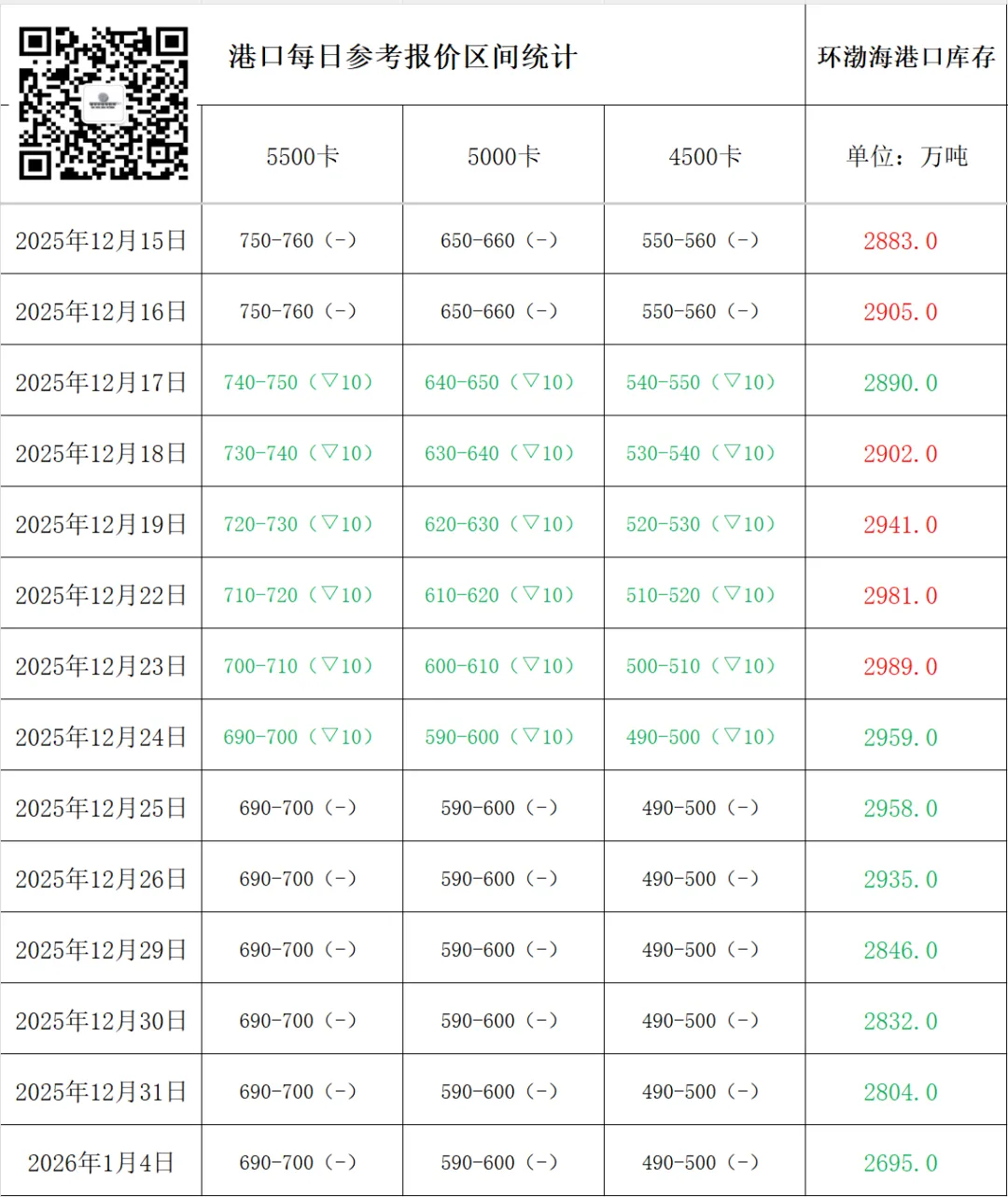 北方环渤海港口动力煤市场情绪在库存持续下降中得到进一步提振。元旦假期期间,港口煤炭调入量维持低位,而部分刚需拉运仍在进行,导致港口库存进一步下降,对市场心态形成正向支撑。在此背景下,今日港口卖方挺价意愿明显增强,多数贸易商选择捂货惜售,观望后续市场变化,报价保持坚挺甚至试探性小幅上探;不过下游需求量仍旧较少,对价格的接受程度有限,询价和观望的较多,成交较少;当下多数市场参与者认为需求尚未实质性改善,且1月煤矿供应陆续恢复,市场供强需弱格局未改,所以预测本轮上涨空间有限,缺乏持续支撑动力。