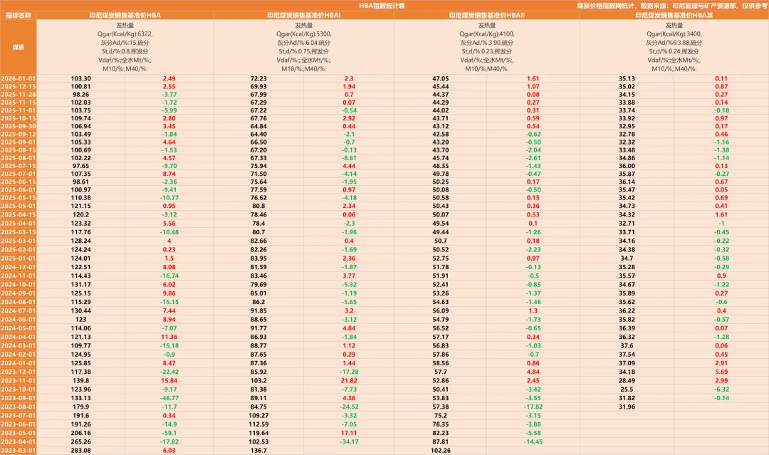【印尼能矿部HBA价格指数】