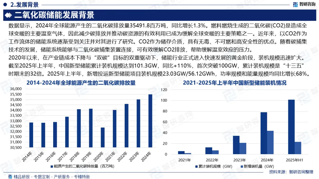 二氧化碳储能是一种气液互转、两态协同储能技术,基本原理是在用电低谷期,利用多余电力将常温常压的二氧化碳气体压缩为液体,并将压缩过程中产生的热能储存起来;在用电高峰期,利用存储的热能加热液态二氧化碳至气态,驱动透平发电。数据显示,2024年全球能源产生的二氧化碳排放量35491.8百万吨,同比增长1.3%。燃料燃烧生成的二氧化碳(CO2)是造成全球变暖的主要温室气体,因此减少碳排放并推动碳资源的有效利用已成为缓解全球变暖的主要策略之一。近年来,以CO2作为工作流体的储能系统逐渐受到关注并对其进行了研究。CO2作为储存介质,具有无毒、不可燃和高安全性的优点。随着碳捕集技术的发展,储能系统能够与二氧化碳捕集装置连接,可有效缓解CO2排放,帮助缓解温室效应的压力。2020年以来,在产业链成本下降与“双碳”目标的双重驱动下,储能行业正式进入快速发展的黄金阶段,装机规模迅速扩大。截至2025年上半年,中国新型储能累计装机规模达到101.3GW,同比+110%,首次突破100GW,累计装机规模是“十三五”时期末的32倍。目前国内已有多个二氧化碳储能项目投运,如芜湖海螺10MW/80MWh二氧化碳储能项目,百穰新能源、东方汽轮机、西安交通大学合作建设的10MW/20MWh二氧化碳+飞轮储能示范项目等。此外,还有多个二氧化碳储能正在建设中,包括华电木垒100MW二氧化碳储能项目、首航高科100MW二氧化碳熔盐储能项目、吉林油田压缩二氧化碳储能科技示范工程等。整体来看,行业仍处于技术示范推广的初期阶段,整体装机规模较小,商业化应用仍需要更多的研究深入和技术突破。未来几年,随着更多示范项目并网运行,二氧化碳储能有望形成与抽水蓄能、电化学储能互补共进的格局,进一步推动我国储能行业规模化、高效化、低碳化发展。