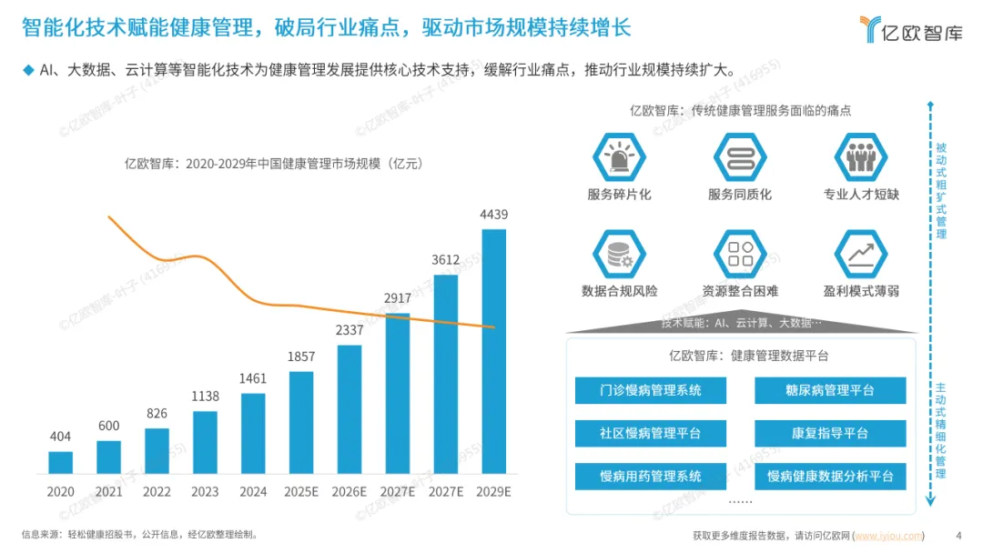 传统健康管理行业面临诸多痛点,包括服务碎片化、同质化、专业人才短缺、数据合规风险、资源整合困难及盈利模式薄弱等。而AI、大数据、云计算等智能化技术的赋能,为行业发展提供核心支撑,推动市场规模持续扩大,2020-2029年市场规模呈稳步增长态势。