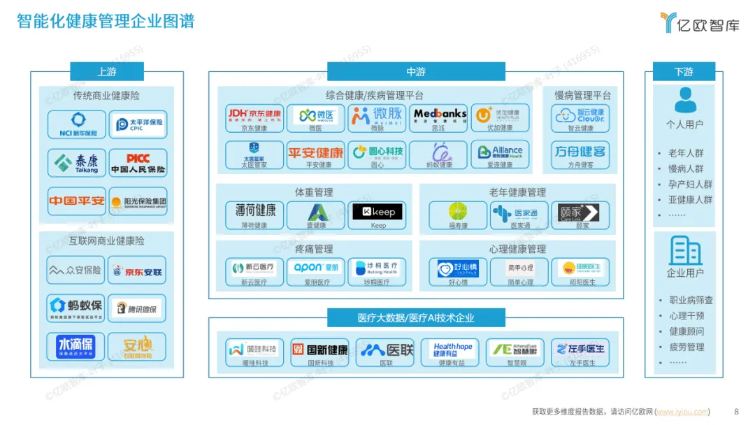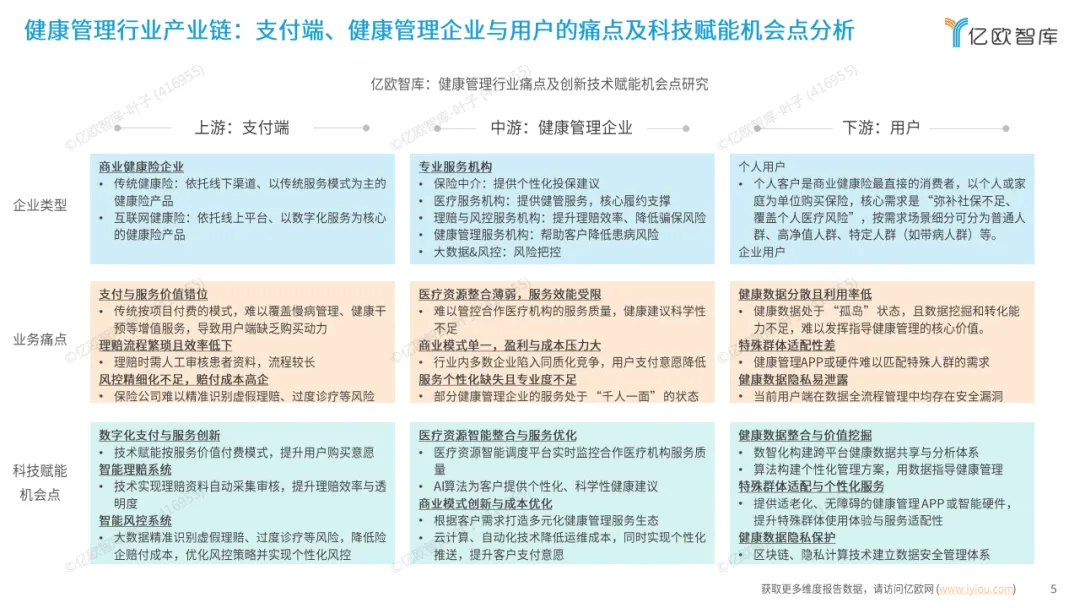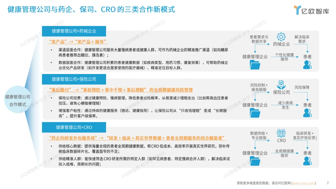 行业产业链涵盖支付端、健康管理企业与用户,各环节均存在痛点,同时也孕育着科技赋能机会。健康管理软硬件协同发力,硬件作为数据入口精准采集、便捷同步各类健康数据,软件则承担数据整合、解读及链接专业服务的功能,二者形成闭环,实现健康管理的早发现与早干预。此外,健康管理公司与药械企业、保险公司、CRO形成三类合作新模式,推动行业服务与生态升级。