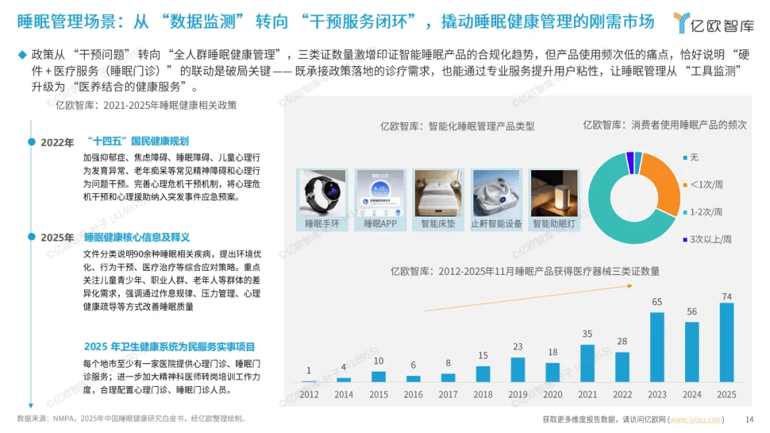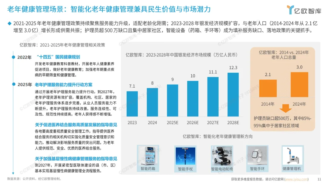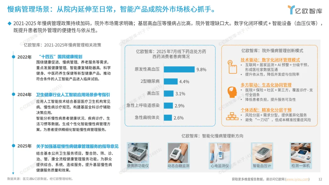 在具体应用场景中,智能化健康管理全面覆盖多元需求。老年健康管理贴合医养结合政策,需求确定性强;慢病管理借助数字化闭环与多方联动模式,填补院外管理缺口;体重管理受益于政策加码,智能设备提升管理科学性;睡眠管理通过智能助眠产品满足全民高频刚需;心理健康管理则依靠智能工具填补服务缺口,适配全人群预防与干预需求。