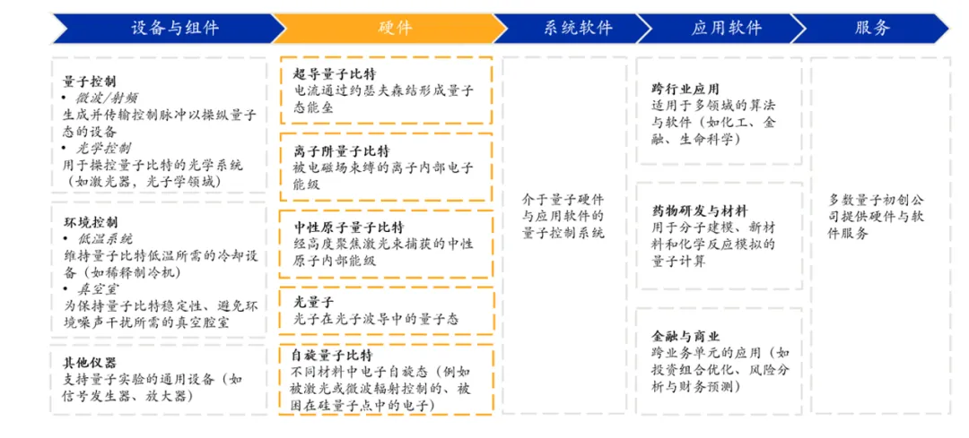 量子计算产业链可分为五个核心层级,当前产业价值正从硬件向上游设备组件与下游软件应用迁移。尽管如此,硬件投入在当前仍是市场的主要构成部分。预计2025年,硬件在量子计算市场中的占比仍将维持在45%至70%的份额,居于主导地位。