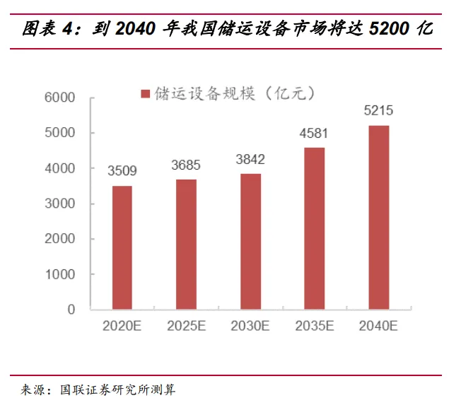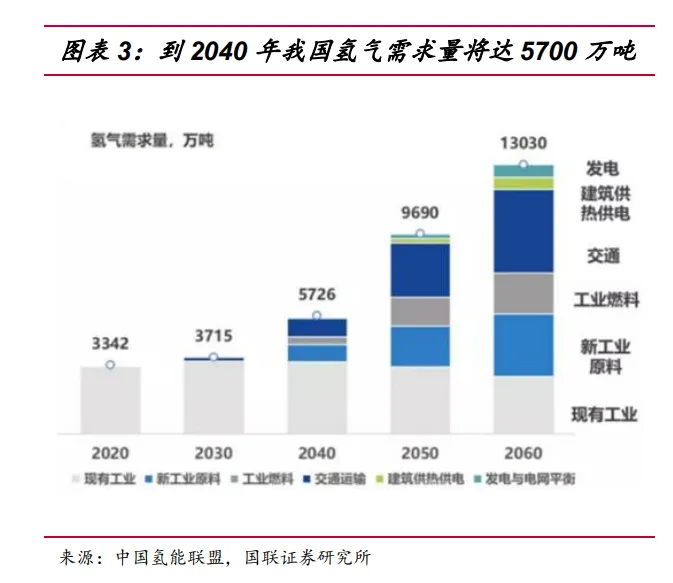 庞大的氢能需求需依靠完善的氢储运供应链,将带来千亿级设备投资规模。在氢能行业深度报告系列二中,我们详尽分析了氢能在工业、交通、建筑等领域参与深度脱碳的潜力,即在 2060 碳中和目标下,据中国氢能联盟预测,到2040 年,我国氢气的年需求量将增至 5700 万吨左右,庞大的氢能需求量需依靠完善的氢储运供应链。假设按照终端氢气售价 30 元/kg,储运成本占比 30%,设备投资成本占比 70%,对应储运设备市场规模将达 5200 亿元。