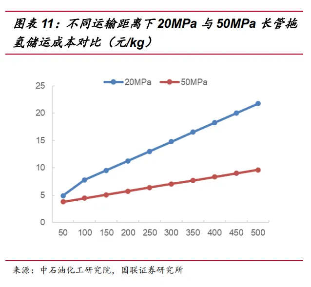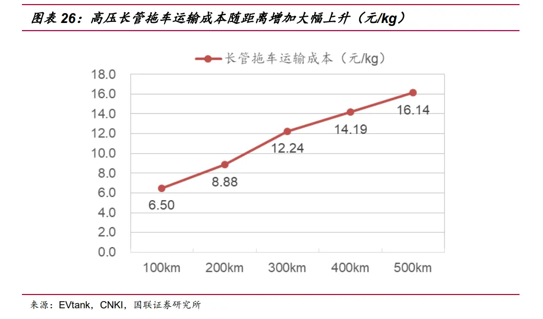 高压长管拖车运输成本随距离增加大幅上升。根据以上假设,可测算出规模为 500kg/d、距离氢源点 100km 的加氢站,运氢成本为 6.50 元/kg。随着运输距离的增加,长管拖车运输成本逐渐上升。距离 500km 时运输成本达到 16.14 元/kg(注:当输送距离超过 200km 后,单辆拖车已无法实现当日往返多次来满足用氢需求,超过 200km 后,我们以多辆拖车同时运输来计算)。因此,考虑到经济性问题,长管拖车运氢一般适用于 200km 内的短距离运输。