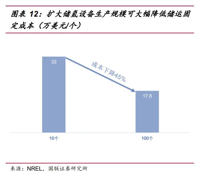 未来长管拖氢储运成本下降的有效路径是:一方面可通过提高储氢压力,实现储氢密度和运输效率都更高的氢气储运方式;另一方面,未来氢气气态储运成本下降的有效路径是扩大相关设备生产量。单位成本将在规模效应下逐步下降。据 NREL (National Renewable Energy Laboratory)预测,当储氢容器需求量从 10 增加到 100 个时,储氢容器成本可下降约 45%。