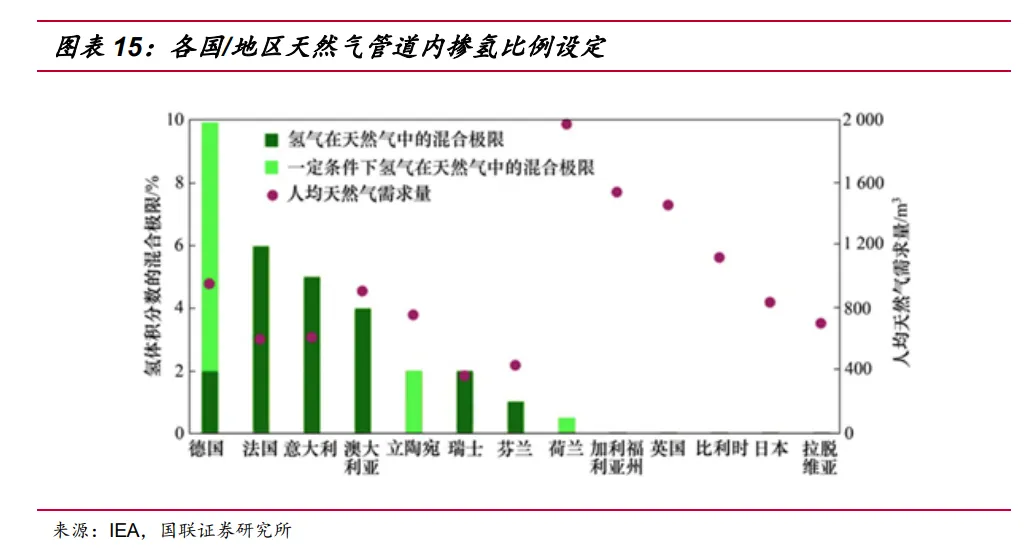 氢能产业发展初期阶段,管道氢可由天然气管道掺氢来实现过渡。由于纯氢管道的初始投资较大,不适合作为氢能发展初期应用,在管道运输发展初期,可以积极探索掺氢天然气方式,即利用已建设的天然气输配管网与基础设施进行天然气和氢气混合输送,也可经改造后输送纯氢,可实现低成本、规模化、连续性氢能供应。研究结果表明,在含量较低时(10-20%掺氢比例),氢气可以在不做重大技术调整的情况下掺混至天然气。未来大力发展天然气掺氢管道输送技术,关键需要解决管材、调压 站、流量计、探测器等配套装备的掺氢相容性与适应性并完善管网安全运行保障技术。 天然气掺氢管道输送技术是目前进行大规模、长距离氢气输送最为有效手段之一。
