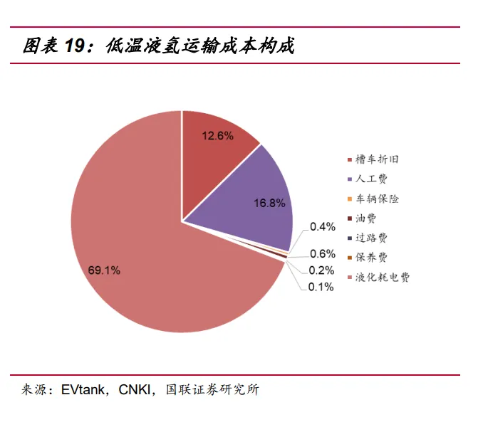 液氢槽罐车的运输成本结构与长管拖车类似,但增加了氢气液化成本及运输途中液氢的沸腾损耗。槽罐车市场价格约 300 万/辆,每次装载液氢约 4000kg 液化过程耗电 15kwh/kg,低温液氢输送成本构成如下: